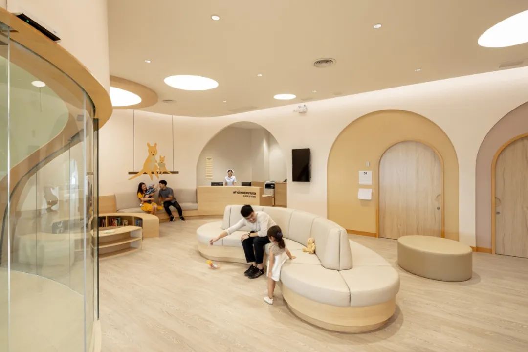 對于生病的孩子來說,富有趣味的內(nèi)飾才是關鍵,拱形門框讓看病成為一場趣味探險,消除了孩子與醫(yī)生間的隔閡。醫(yī)院的一樓和二樓都有兒童游戲區(qū)域,原本對于家長和孩子來說十分難熬的候診時間,便可以在這里悠閑的度過。當然醫(yī)院內(nèi)也有專門的等候空間,不同于以往醫(yī)院中冷冰冰的不銹鋼座椅,柔軟的觸感、彎曲的造型都十分人性化。