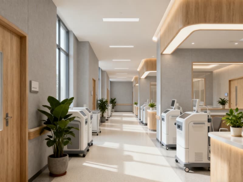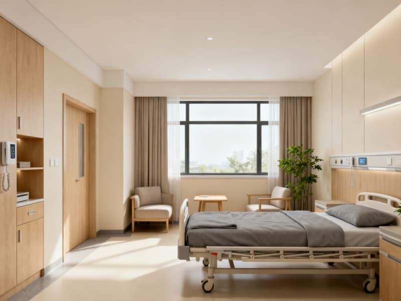 設(shè)計中融入自然元素與人文關(guān)懷,通過大面積采光引入自然光線,搭配隨處可見的綠植景觀,緩解醫(yī)療環(huán)境帶來的緊張感。家具與設(shè)施均采用圓潤的造型與舒適的材質(zhì),避免尖銳棱角,同時注重防滑、無障礙等細(xì)節(jié)設(shè)計,適配休養(yǎng)人群的使用需求。