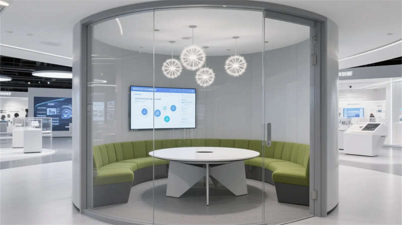 入口以光帶引導(dǎo)與生態(tài)綠墻開啟敘事,核心展區(qū)通過懸浮觸控與嵌入式展臺(tái)聚焦技術(shù)創(chuàng)新。數(shù)字沙盤區(qū)突破物理限制,以天地屏聯(lián)動(dòng)呈現(xiàn)發(fā)展藍(lán)圖;智能會(huì)議艙可隨時(shí)轉(zhuǎn)化為協(xié)作中樞,通透隔斷維持空間對(duì)話性。文化長廊以光影步道承載企業(yè)精神,生態(tài)休憩區(qū)則借自然光影與苔蘚景觀構(gòu)建減壓綠洲。